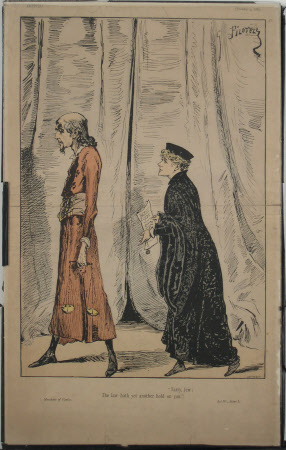 Print, cartoon, Sir Henry Irving (1838-1905) as ‘Shylock’ and Dame Ellen Terry (1847-1928) as ‘Portia, from William Shakespeare’s ‘Merchant of Venice’ by Georges Labadie Pilotelle (1844-1918). From The Sketch of Jan 3rd 1880.