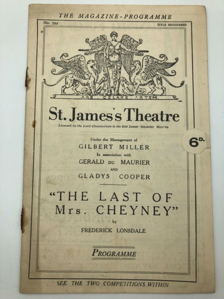 Did odd jobs. Tried on Swiss outfit, socks To Lab for ear-phones. To Bumpus’and Pemberthy’s. Home to lunch late. To Head’s and to Paul Faraday, 1A The Boltons to tea. He drove me home in his Rover. Supper while walking to St James Theatre. Pit. Sat from 6.50 till 8. “The Last of Mrs Cheyney” – Du Maurier and Gladys Cooper.
