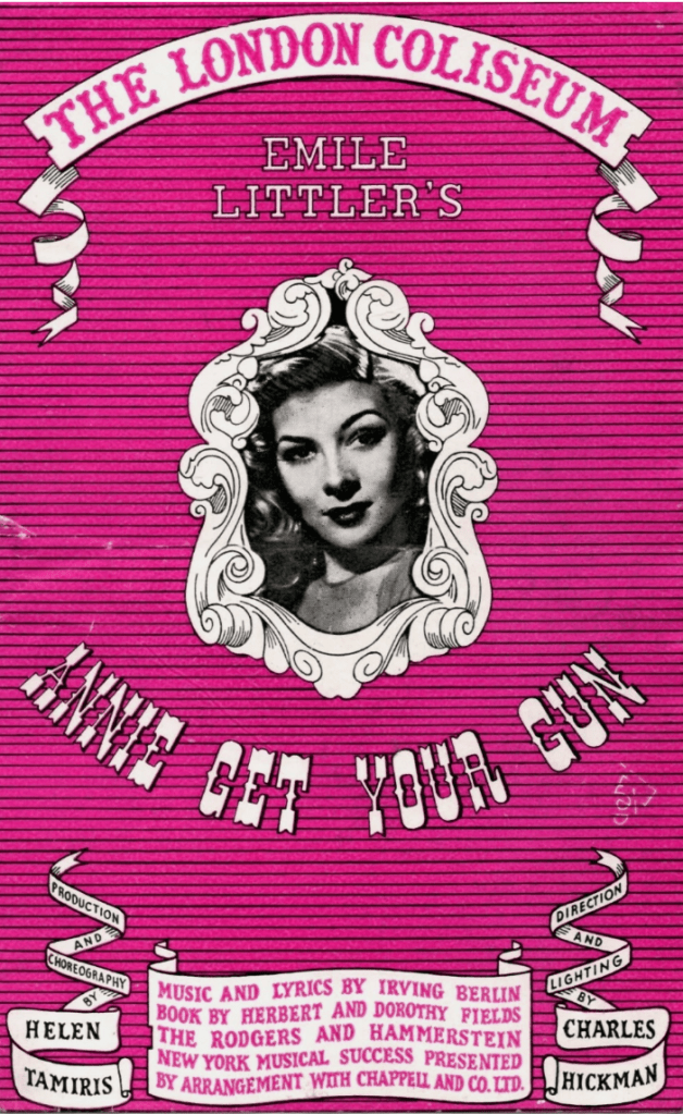 Alys phoned – Phil passed 1st part exam! I to Hawkins, Lisson Grove, Auction (met Kit there) – her family furniture and my pair of curtains. We had lunch at Bun Café. Home and in all p.m. Alys came about 5 and Phil 515 (he’d been at Charing Cross in museum of bottle specimens). They left at 5.45, after coffee and I had supper – egg and cheese and then at 6.30 to Coliseum – “Annie Get Your Gun”, Dolores Grey (Irving Berlin). Home 10.45.