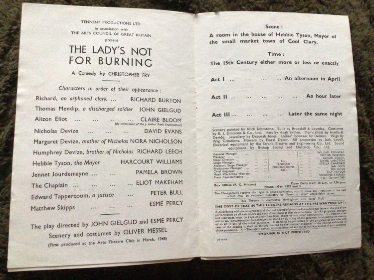 Stayed in all a.m. Prepared beds, and at 12.30 new mattress arrived. To Club, to lunch. Read papers there. Back (walked) to 119 Bickenhall Mansions. Cleaned floors and re-covered pillow with underslip (Phil). 6.38 express to Moor Park. Phil met me 7.7. Soup (chicken), grilled herrings, ice and chocolate sauce. “The Constant Wife”, Maugham with Pamela Brown (“The Lady’s Not For Burning”).
