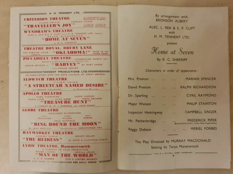 Mrs Bearcroft cleaned around. I put lace on frocks and took tuck. Steak, beans. In BHN to shops. 2.30 hair trim by 1/-. Home. Dressed. Walked to 4.29 to Baker Street. 119 Bickenhall Mansions. On to English Speaking Union (No. 11). We had snack meal 6.30. Taxi to St James‘s Theatre. “Captain Caravallo” by Dennis Cannon – Diana Wynyard, James Donald. Together walked to Berkeley Street then tube 10.21 at Baker Street. Home 11.